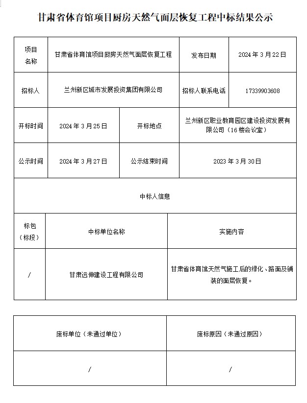 甘肃省体育馆项目厨房自然气面层恢复工程中标效果公示